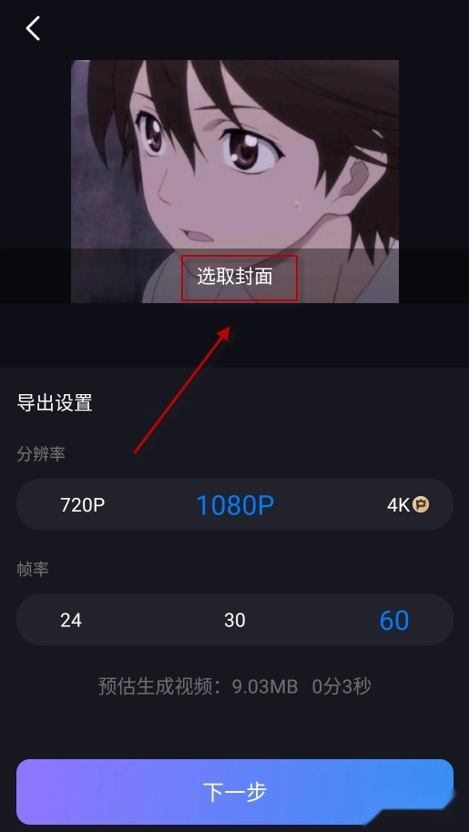 点击“选取封面”选项,挑选视频素材的封面,接着点击“下一步”按钮。