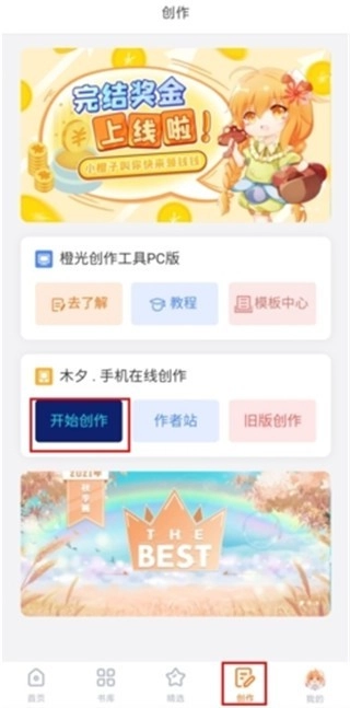 在创作页面里点击开始创作按钮(橙光创作工具仅支持在PC端使用)