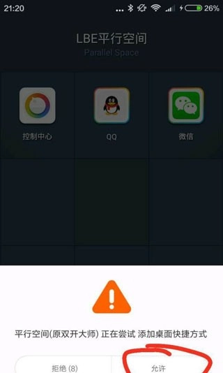 将你想要的软件添加到"LBE平行空间"界面中。