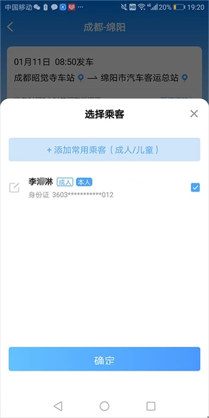 在底部弹出页面选择乘客信息,可添加常用乘客。