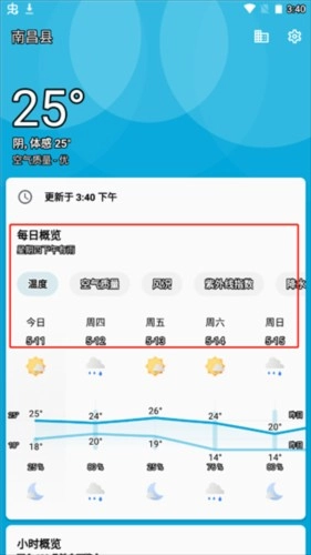 在主页向下滑动即可刷新,主页信息十分全面,点击“每日概览”就能查看15日的预报数据,其下方依次排列着“小时概览”“空气质量”“日月升落”和“详细数据”板块。