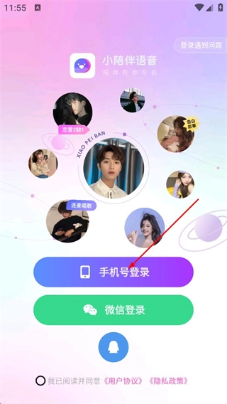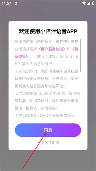 在“小陪伴语音”的欢迎弹窗里,点击“同意”按钮,即可进入登录方式选择页面。