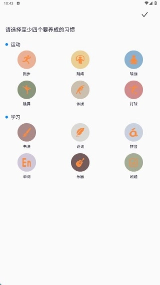 进入运动打卡界面,根据自身的运动安排与学习规划,设定习惯培养的目标。