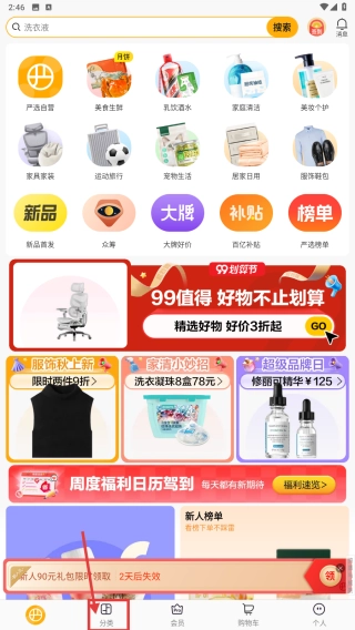 打开电商类应用,点击底部的分类选项,进入商品分类页面。