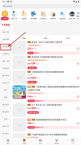 在商品分类页面,点击“家具家装”分类选项,即可进入家具家装商品的列表页面。