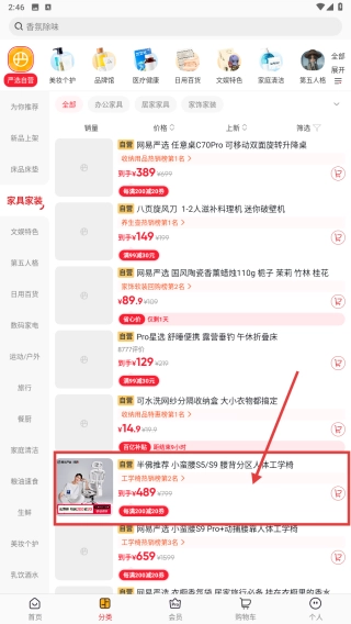 在家具家装商品列表里,找到半佛推荐的小蛮腰S6/S69靠背分区人体工学椅,点击进入该商品的详情页面。