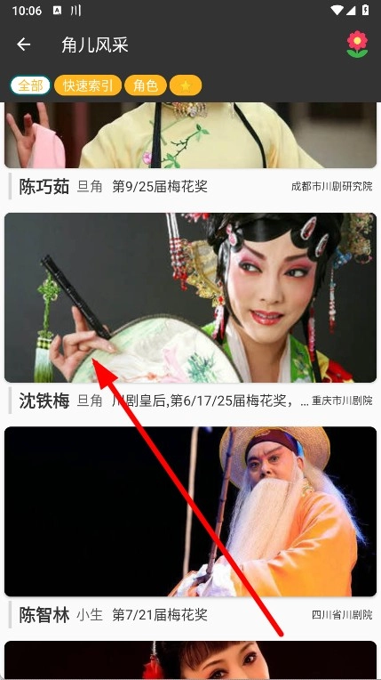 在角儿风采页面,选择感兴趣的川剧演员。