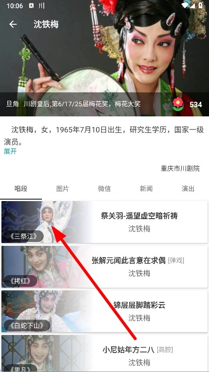 进入演员详情页,点击唱段标签,选择唱段。