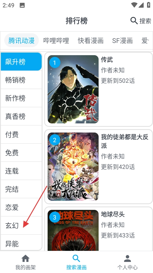 在排行榜页面,点击左侧的玄幻分类,查看玄幻类漫画排行。