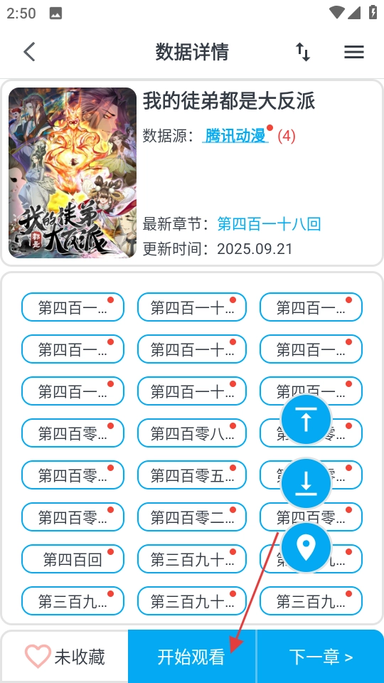 在玄幻漫画的排行榜里,挑选自己感兴趣的作品,比如《我的徒弟都是大反派》,随后进入这部漫画的数据详情页面。