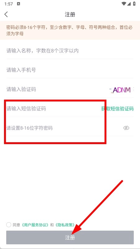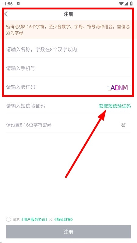 在注册页面填写名称和手机号,输入验证码后获取短信验证码。