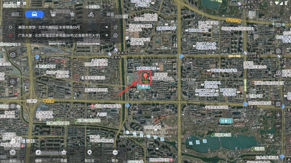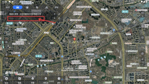 同时,也能在地图上查看其他地点(例如美国大使馆位于北京市朝阳区安家楼路55号)的位置信息,以便开展地点对比或路线规划工作。