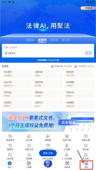 进入法律分类板块后,点击页面底部的“我的”选项,即可进入个人中心界面。