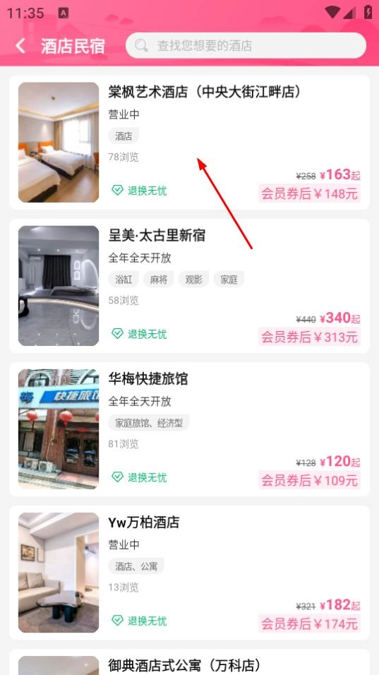 在酒店民宿的列表页面,挑选你打算预订的酒店,例如棠枫艺术酒店。