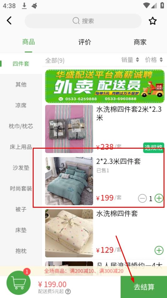 在商家列表页面,点击新买的,如床品分类标签。