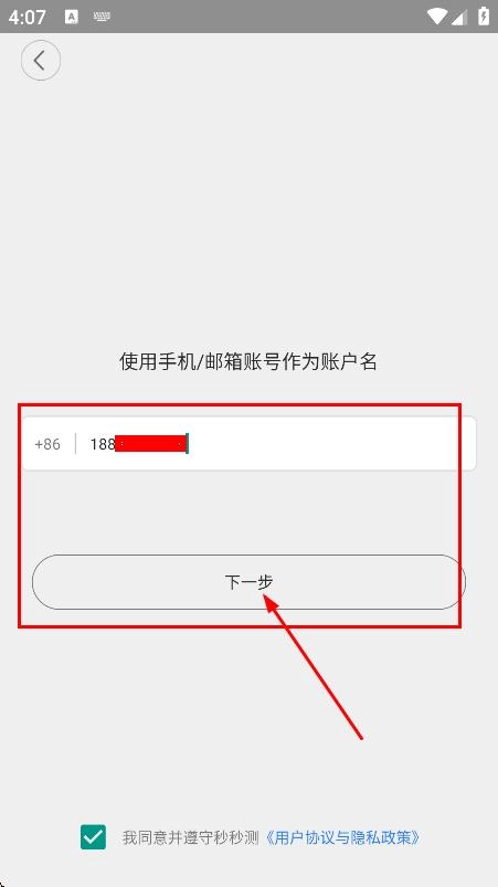 在账户注册的手机号填写界面,输入手机号码后,点击下一步按钮。