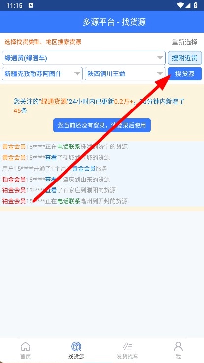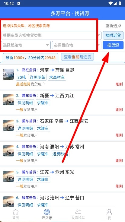 在货源查找页面,选定找货类型、出发地与到达地后,点击搜索货源按钮。