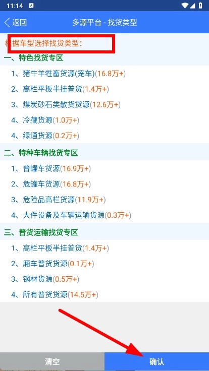 进入找货类型的选择界面,选好合适的找货类型后,点击确认按钮。