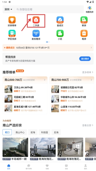 打开房产类应用程序,找到并点击二手房板块的入口,随后即可进入二手房房源的列表页面。