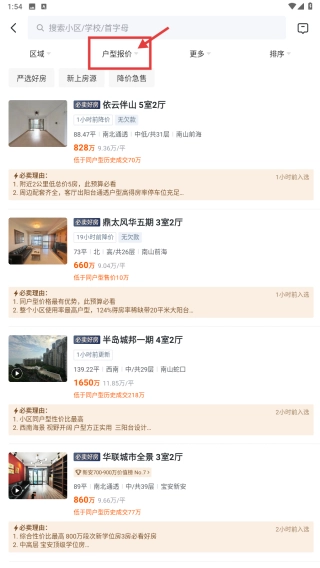 在房源列表页面,点击户型或总价的筛选选项,即可进入筛选条件的设置页面。