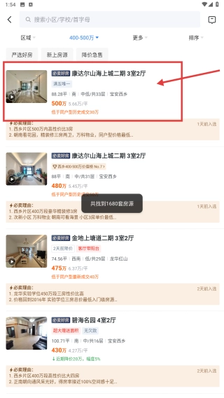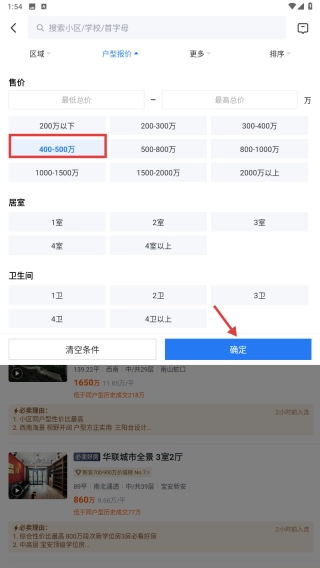 在总价区间中选定400万到500万的范围,点击确认按钮,以此来应用筛选条件。