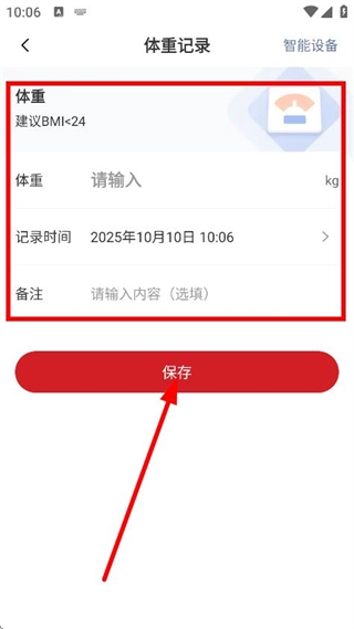 在体重记录页面,填写体重等相关信息后,点击保存按钮,即可完成体重记录操作。