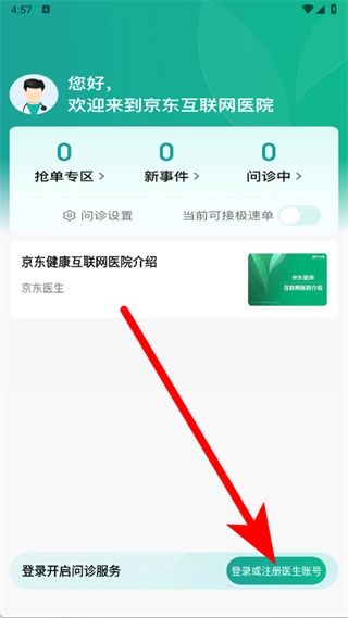 打开京东医生应用,找到页面底部的“登录或注册医生账号”按钮并点击。