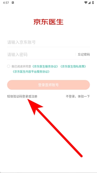 在京东医生的登录界面,选择短信验证码登录或注册的选项。