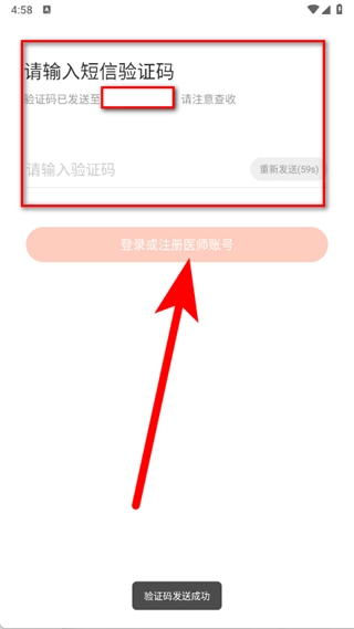 在短信验证码的填写页面,输入你收到的验证码后,点击登录按钮或者注册医师账号的选项,这样就能完成注册流程了。