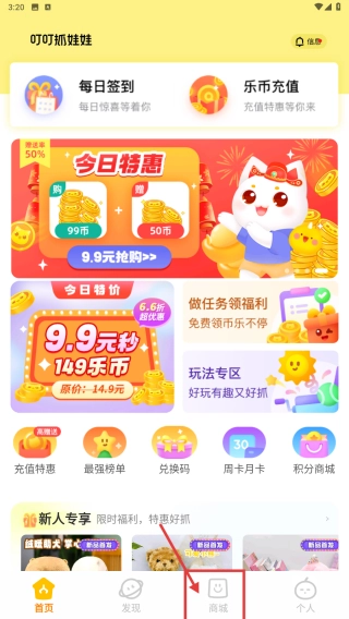 打开叮当抓娃娃类应用后,点击底部的商城选项,即可进入商城板块。