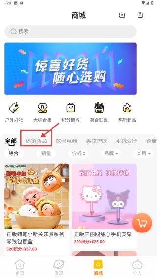 在商城页面,点击“热销新品”分类标签,即可筛选出该品类下的商品。