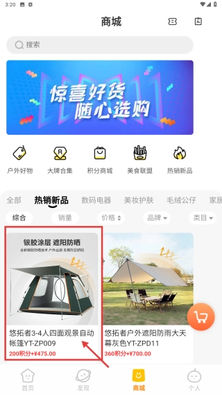 在热销新品的商品列表里,找到悠拓者3 - 4人四面观景自动帐篷YT - ZP009这款商品,然后点击进入它的详情页面。