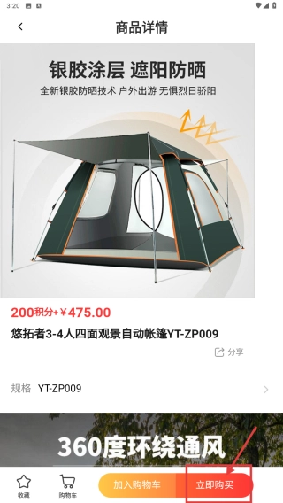 在商品详情页面,点击“立即购买”按钮,即可开展这款帐篷的购买流程。