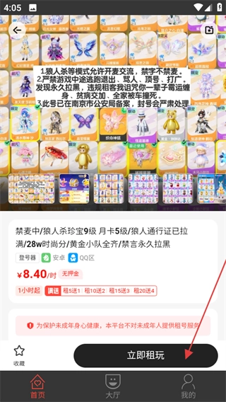 在账号详情页,点击“立即租玩”按钮,若用户尚未登录,则会跳转至登录页面。