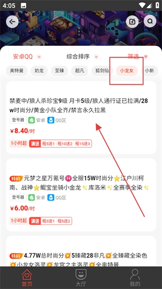 在游戏租号列表页面,先筛选出你想要的标签(比如“小龙女”),接着挑选出心仪的账号,然后进入该账号的详情页面。