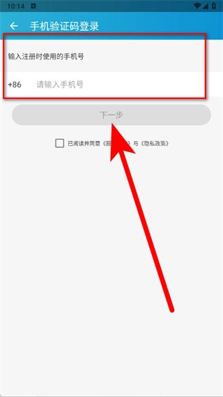 在手机验证码登录页面,输入用于注册的手机号,勾选同意相关条款后,点击下一步按钮。