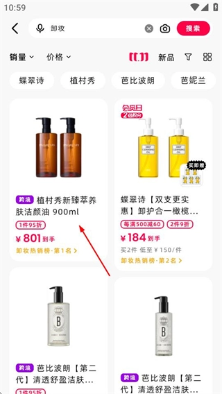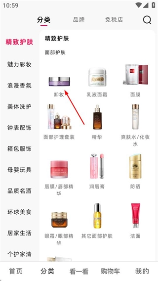 在分类页面,选择卸妆分类,进入卸妆商品列表页面。