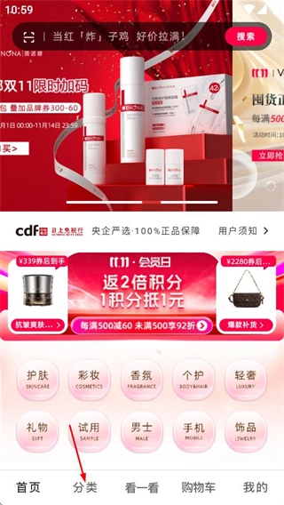 在日上免税店首页,点击分类选项,进入分类页面。