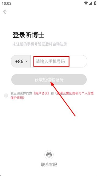 在登录听博士页面输入手机号码,勾选相关协议后,点击“获取短信验证码”按钮。