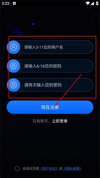 依次填写用户名、密码及确认密码,点击“现在注册”按钮,即可完成账号注册流程。