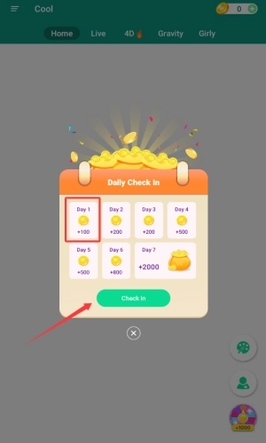2、在签到界面,点击第一天领取金币按钮。
