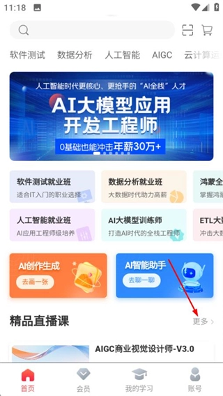 在学掌门首页,点击精品直播课右侧的更多选项,进入选课中心页面。