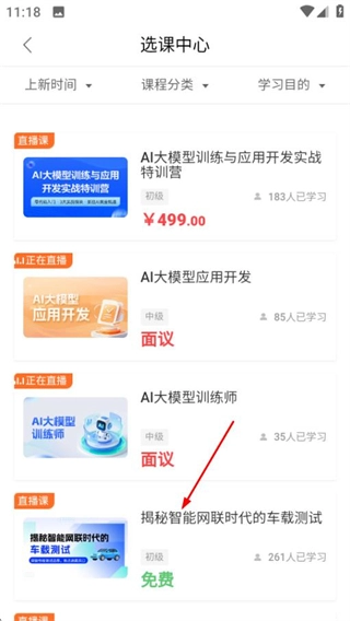 在选课中心页面,找到并点击“揭秘智能网联时代的车载测试”这门课程,进入其详情页面。