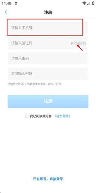 在注册账号页面填写手机号码后,点击获取验证码。