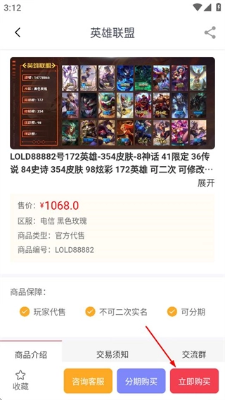 在英雄联盟商品列表页面,点击想要查看的账号商品,就能进入该商品的详情页。