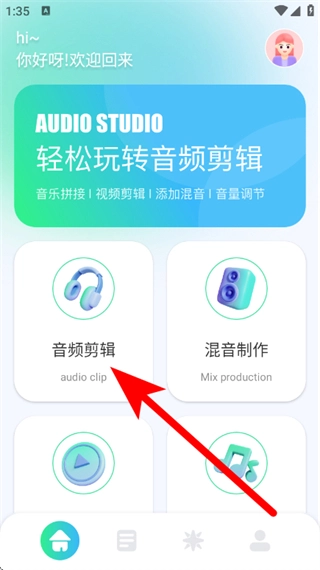 在小橘音乐的首页,找到并点击音频剪辑选项,即可进入选择音频的页面。