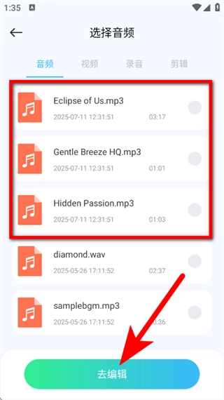 在音频选择页面,选定目标音频后点击“去编辑”,即可进入音频剪辑界面。