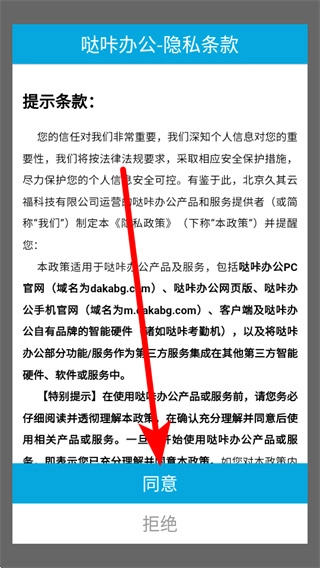 打开哒咔办公应用,待弹出相关提示窗口后点击“同意”按钮,即可进入注册流程对应的操作界面。