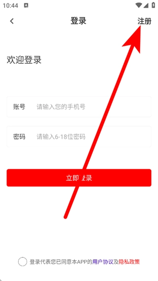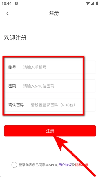 在注册页面,先输入手机号,接着设置密码,然后点击注册按钮,即可完成账号注册流程。