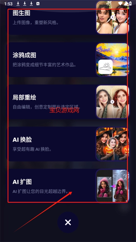 5、挑选所需功能进入,此处选择图生图功能,导入图片,并选定图片尺寸